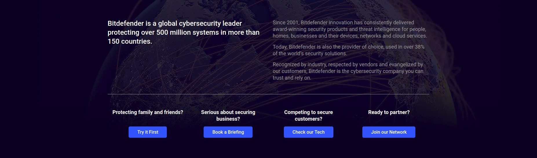 Bitdefender delivers robust security you can rely on. With a global security delivery infrastructure protecting half a billion users, visionary solutions, and a wealth of awards, we have been a trusted security provider since 2001.