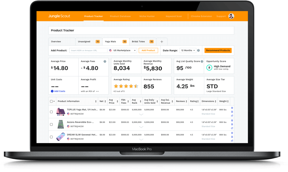 Quickly filter out the noise by taking advantage of Jungle Scout’s Product Database. Reveal Amazon product opportunities by applying a wide variety of filters, including category, review counts, and average sales.