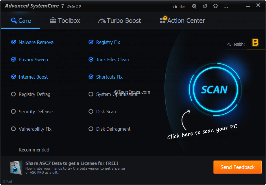 Advanced SystemCare is an all-in-one yet easy-to-use software to clean, optimize, speed up, and protect your PC and your privacy. The powerful 1-click approach helps you easily clean up junk files, leftovers, and invalid shortcuts, sweep privacy traces, remove spyware threats, accelerate Internet speed, manage startup items, and fix system weakness & security holes.